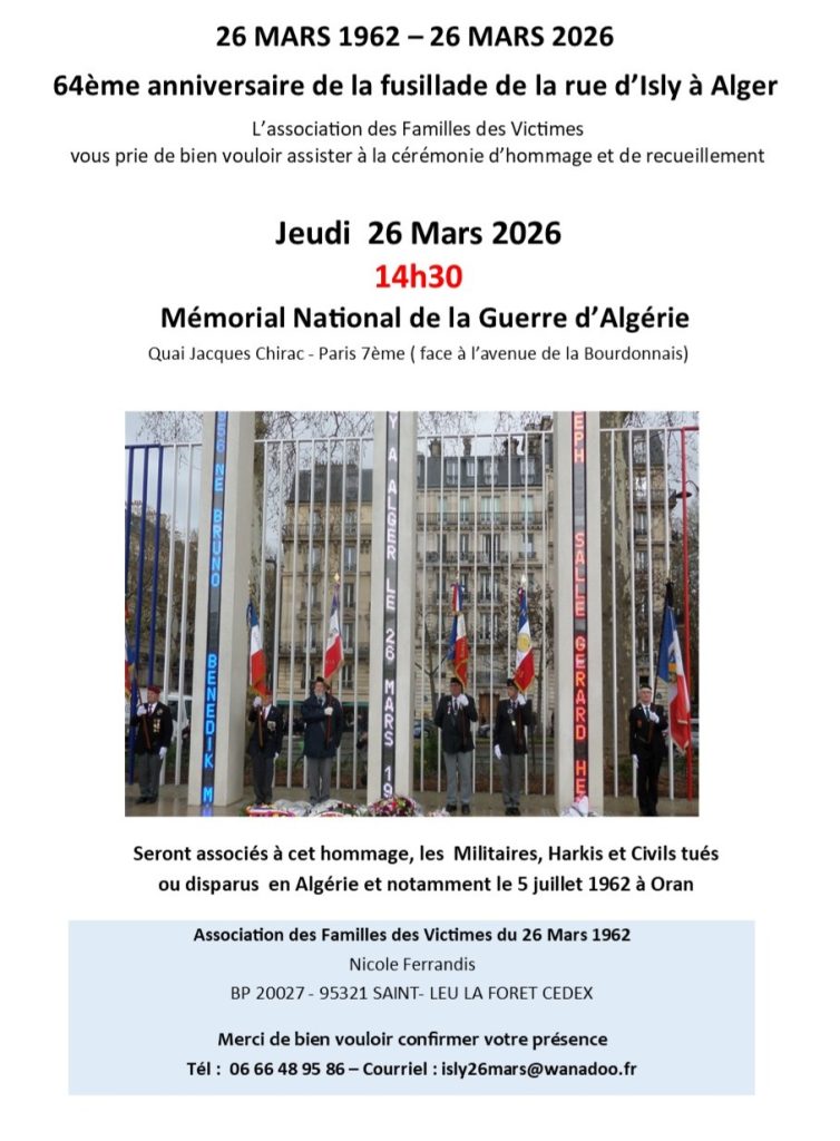 - à 14 h 30 au Mémorial National de la guerre d’Algérie et des combats du Maroc et de la Tunisie